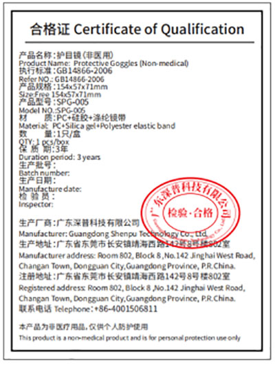 3.Occhiali (senza fori di ventilazione) Parameter specifications