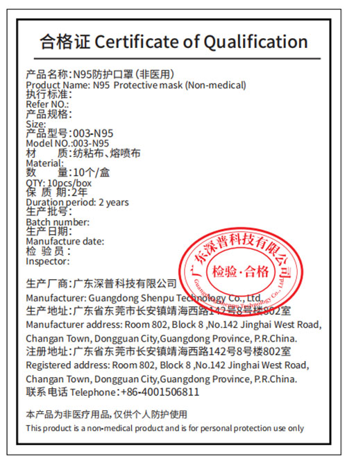 N95 maschera protettivaï¼ï Cup shapeï¼ ‰ -Certificate ofQualification